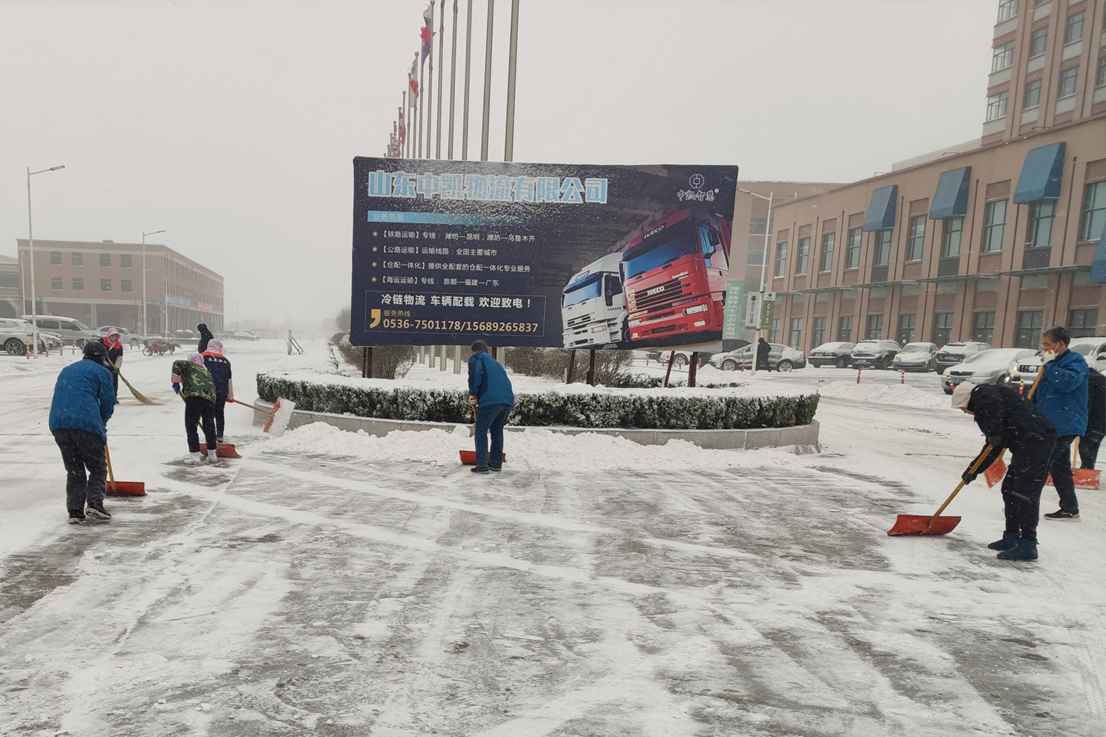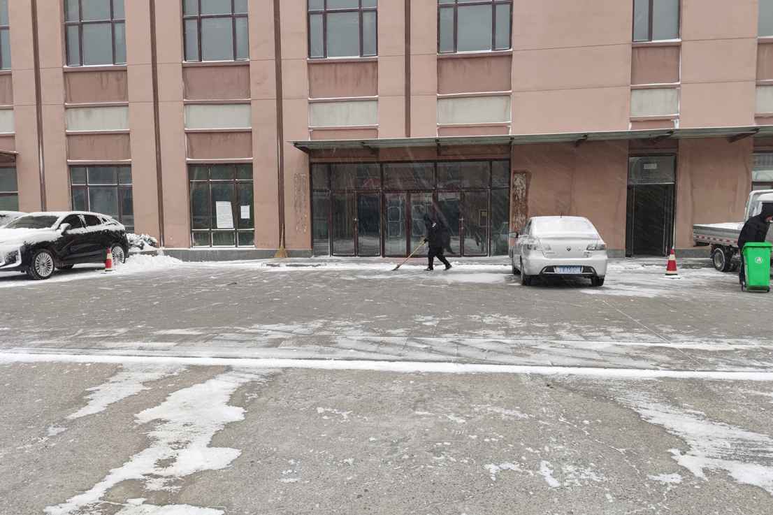 由于降雪較大,地面的積雪厚厚一層,只能鏟雪板先行,再用掃帚和鐵鍬跟進(jìn),經(jīng)過(guò)數(shù)小時(shí)的奮戰(zhàn),終于將園區(qū)的西門(mén)、北門(mén)、主干道、地下停車場(chǎng)入口、商務(wù)樓、一號(hào)冷鏈南門(mén)等路段的積雪清除完畢,最大